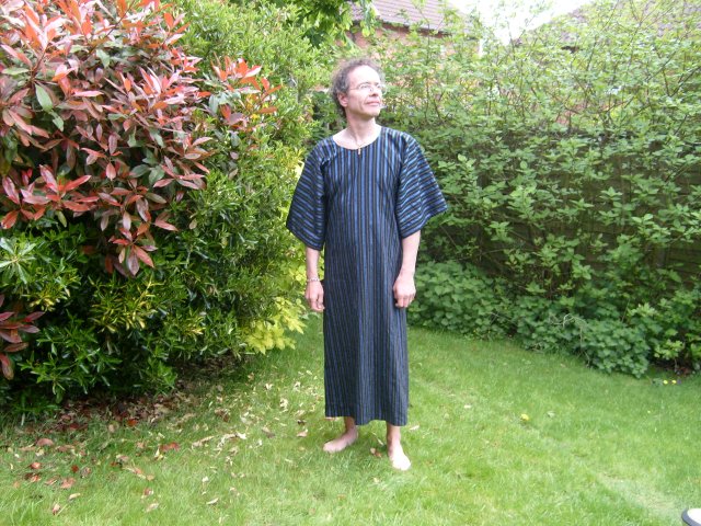 Building on the design of the yukata and aiming to eliminate the negatives, one comes to a basically tubular garment, like a yukata permanently sewn up at the front. This then has to go on over the head, but it is then quite secure and needs no belt. I call this a tunic. It is similar in idea to the basic dress of the ancient Romans, and many other people, though then usually belted about the waist. Nevertheless, my wife calls it a dress. No matter, it is designed to a specification, not a social convention.